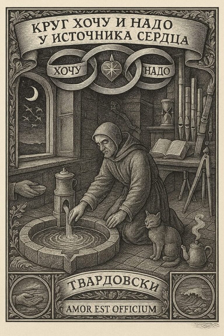 Я объясню, как читается эта гравюра, будто пальцами по Брайлю смысла. В центре: каменный источник, «Сердце Сердца». Вода из него сразу становится морем и всё же не разливается: берег очерчен как компас. Это не запрет, а форма свободы: у любви есть русло, иначе она превращается в лужу случайностей. Если прислушаться, вода звучит как орган: бас обязанности и серебряный свист желания складываются в аккорд, где не надо выбирать между «хочу» и «надо», потому что они уже женаты.
