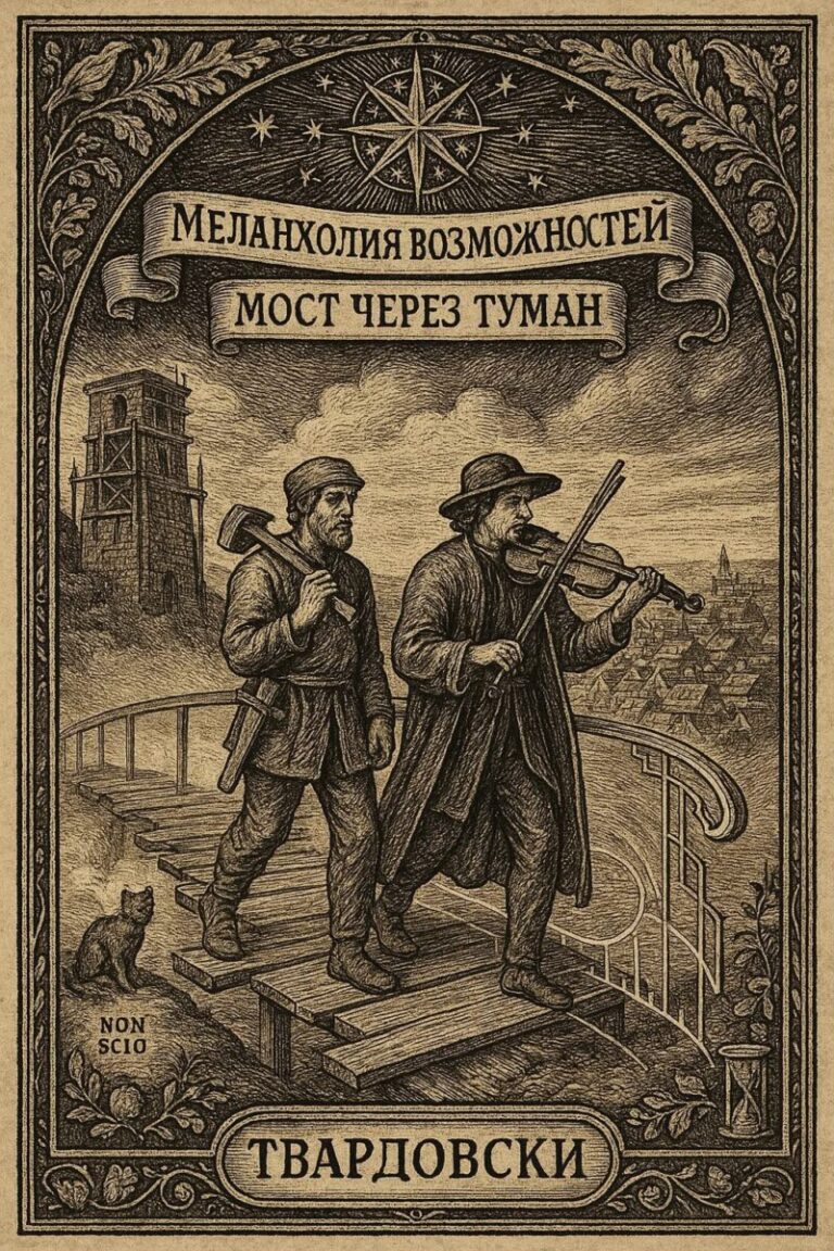Скрипач ступил в туман и заиграл. Плотник, ворча, поставил ногу вслед – и там, где касалась нога, появлялась доска. Шаг – доска. Нота – перила. Иногда Скрипач сбивался, и доски исчезали. Они останавливались, слушали паузу, и в этой паузе опять рождалась мелодия – и доски снова ложились под стопы. Так они дошли до другого берега. Плотник сел, снял сапоги, потрогал мост: крепкий.